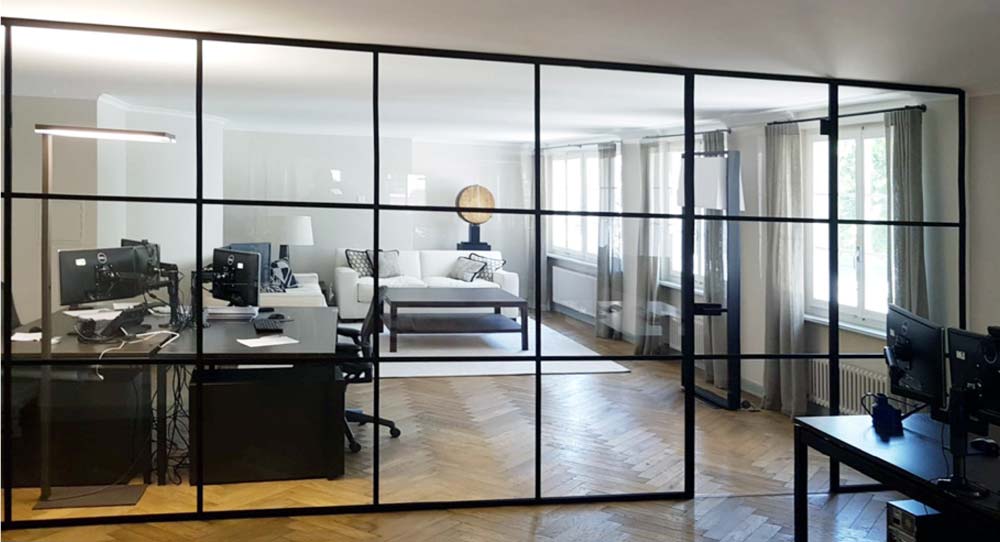Neue Blickwinkel mit kreativen Lösungen für private und gewerbliche Büros dürfen entstehen. Ob elegante Raum-in-Raum Lösung oder Besprechungsbox für akustischen Schutz, unsere Verglasungssyteme Systeme integrieren grösstmögliche Transparenz. Auch eine Abtrennung im Wohnbereich kann auf Kundenwunsch massgeschneidert werden.
