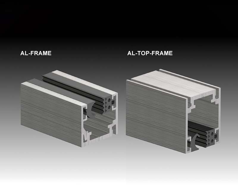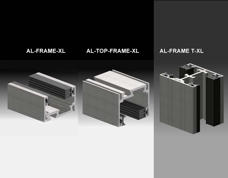 Basierend auf AL-OFFICE XL System. Für horizontale und vertikale Unterteilungen. Die Sprossen können frei positioniert werden. Speziell entwickeltes Adapterprofil Frame P-D-XL zur Reduzierung der Glastärke
