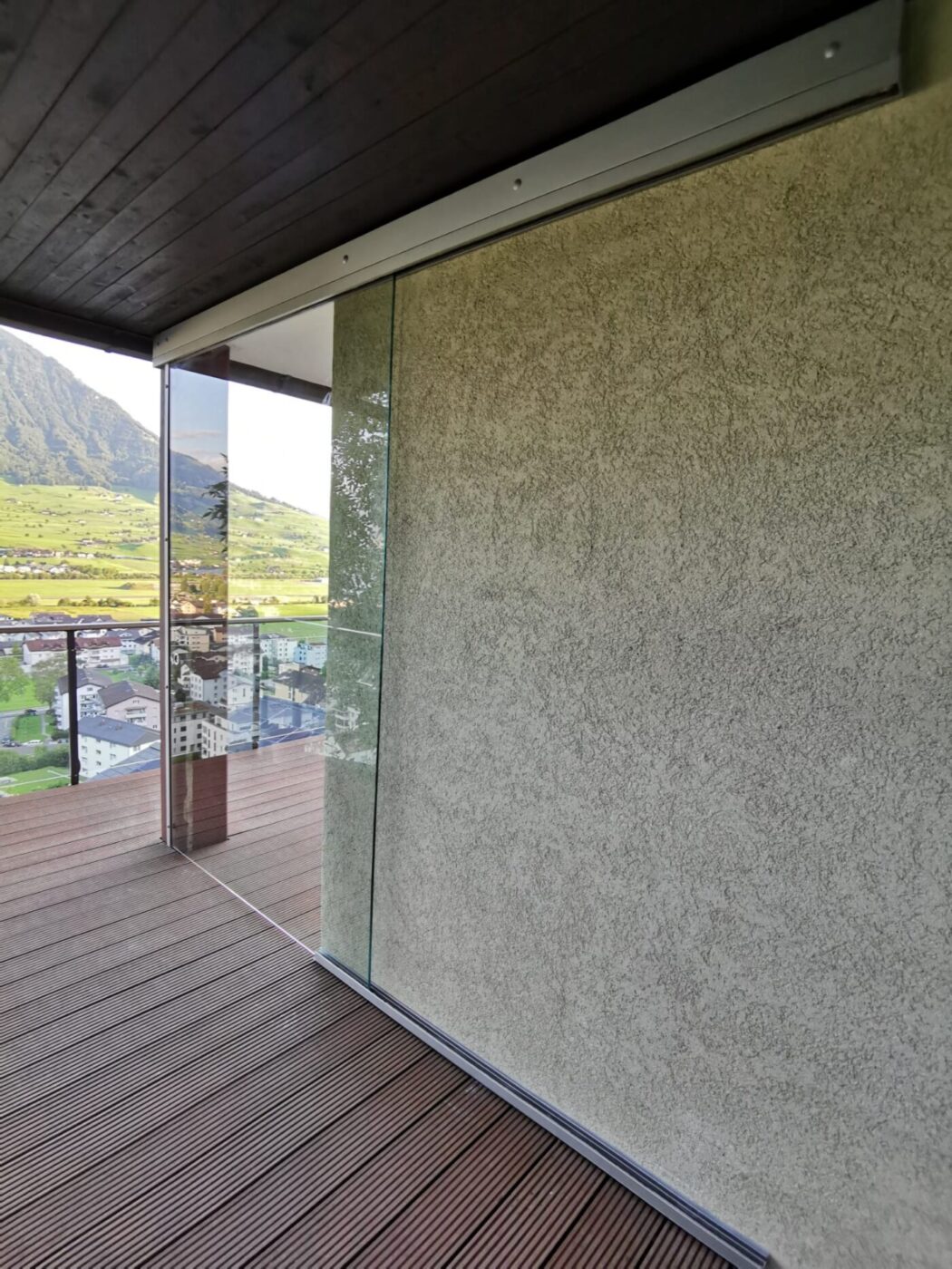 Nichts trübt den Blick nach draussen, denn die Ganzglas- Schiebewand GS-110 ist in ihrer Standardausführung frei von vertikalen Profilen. Ist die obere Schiene in die Decke eingelassen, sind keine Profile sichtbar. Lediglich unten ist ein dezentes Aluprofil und ein praktischer Handgriff für das Öffnen und Schliessen der Schiebwände auszumachen.