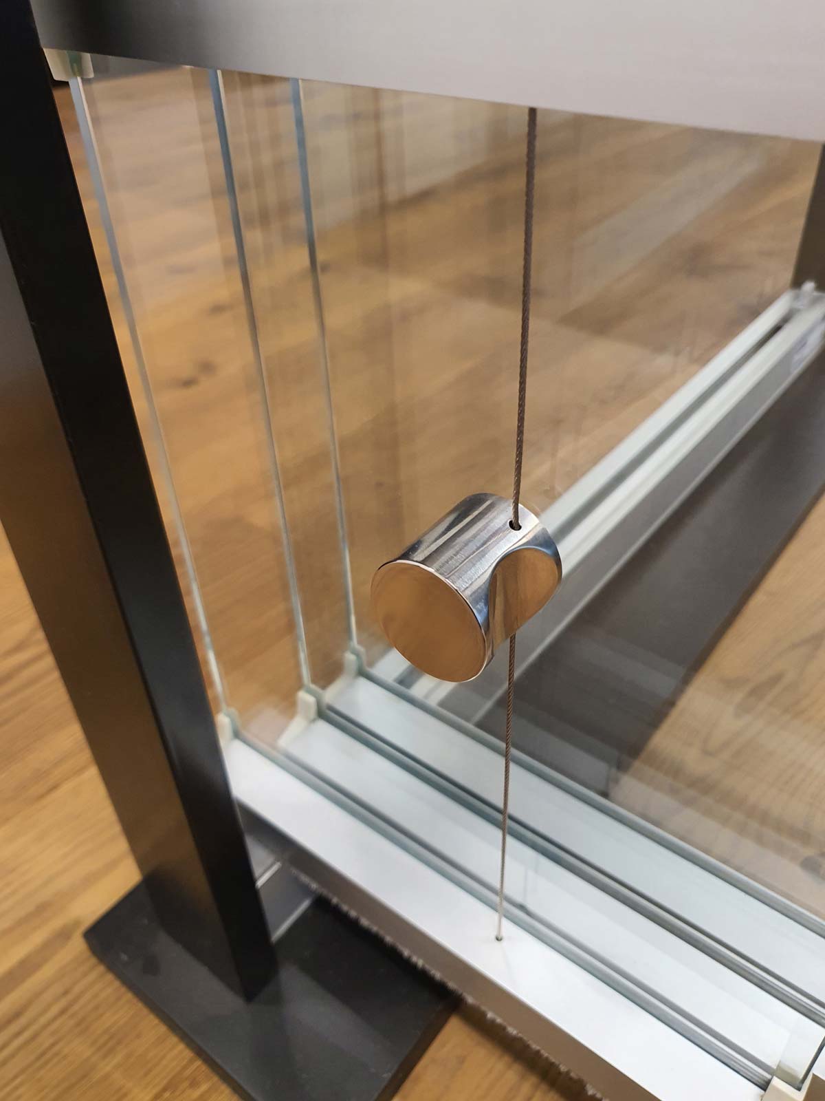 Die Einfachrolle verschwindet beim Schliessen der Glasflügel  in der zum laufschienenprofil flächenbündigen Ausfahrt.